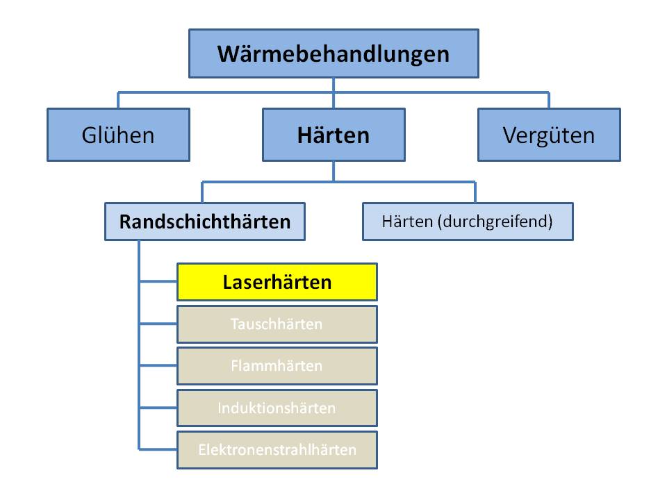 Das Laserhärten fällt in den Bereich der Wärmebehandlung. In der Industrie werden heutzutage sehr viele Stähle wärmebehandelt, um die gewünschten Eigenschaften zu erhalten. Wärmebehandlungen werden in Glühen, Härten und Vergüten unterteilt. Das Härten wird weiter in Härten, bei dem das ganze Werkstück gehärtet wird, und Randschichthärten unterteilt. Beim Laserhärten handelt es sich um einen Randschichthärtevorgang. Der Härtevorgang ist beschränkt auf geringe Eindringtiefen an der Oberfläche des Werkstückes.